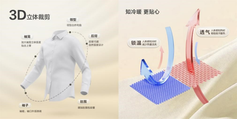 所謂0感,指的是“0壓、0皺、0摩擦、0束縛”。0感舒適襯衫首創紅豆超細旦纖維,輕如羽毛,彈性十足,透氣性極佳,即便炎炎夏日,也能感受到如沐春風般的涼爽與自在。同時,創新運用瑞士HeiQ智能控溫科技,讓面料擁有感知外界溫度并自動調節的能力,實現“熱縮冷脹”智能溫控效果,在任何環境下都能保持恰到好處的舒適。